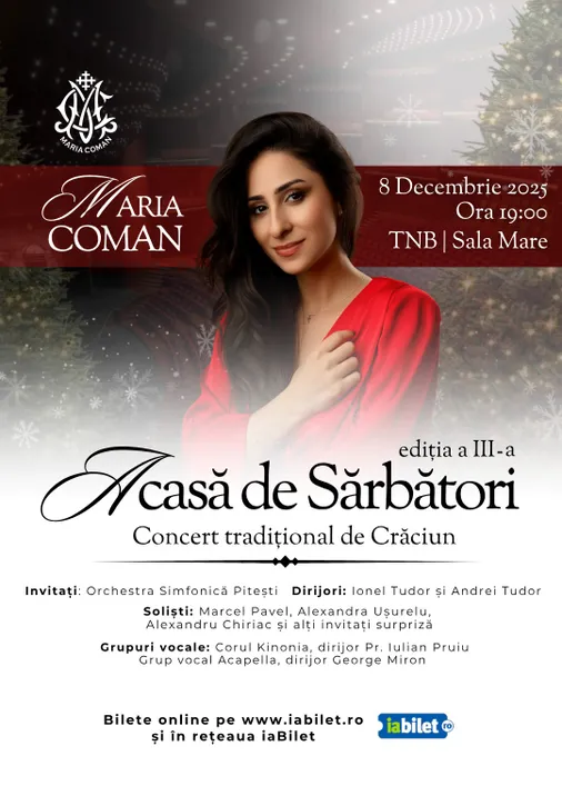 Ediția a III-a a concertului tradițional de Crăciun al Mariei, "Acasă de Sărbători " bate la ușă! Fii și tu parte din povestea ei, cu note bizantine și simfonice, accentuate de grație, feminitate și noblețea unei trăiri pline de profunzime!