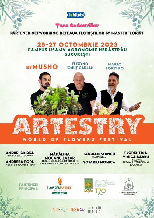 De asemenea, veți putea admira talentul maestrului Flexyno și al altor artiști florali de excepție precum Andrei Bindea(Flori cu Efect de Wow) sau designeri florali care sunt absolvenți ai prestigioasei Facultăți de Horticultură din cadrul USAMV București: Mădălina Mocanu Lazăr, Andreea Popa, Bogdan Stancu, Șofariu Monica, Florentina Vinicu Barbu.