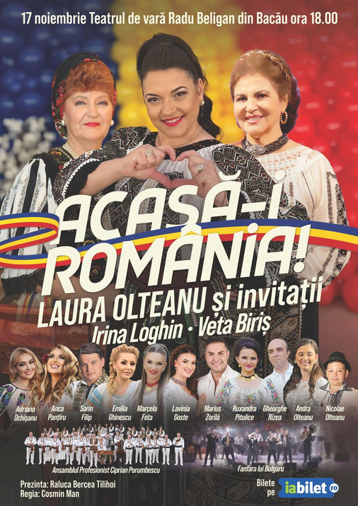 Bucovina Events vă invită la o nouă ediție a spectacolului folcloric *ACASĂ-I ROMÂNIA*, un eveniment de excepție care celebrează spiritul românesc, tradițiile și valorile autentice ale neamului nostru. Acest regal folcloric promite să ofere momente de neuitat, pline de emoție și patriotism.