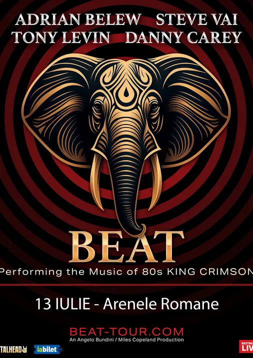 BEAT este unul dintre cele mai mari supergrupuri din industria muzicala. Numele provine de la album lansat de King Crimson in 1982. Din formatie fac parte Adrian Belew si Tony Levin din King Crimson, Danny Carey tobosarul Tool, considerat unul dintre cei mai mari tobosari ai scenei rock si metal, si Steve Vai, chitarist care nu mai are nevoie de nicio prezentare. Acesti 4 artisti vor interpreta piese de pe cele 3 album semnate King Crimson si lansate in anii '80, 'Discipline', 'Beat' si 'Thee of a perfect Pair', dar reinterpretate in maniera proprie. Un concert ce se anunta a fi un regal muzical si o ocazie unica de a-i vedea pe cei patru artisti impreuna pe aceeasi scena.