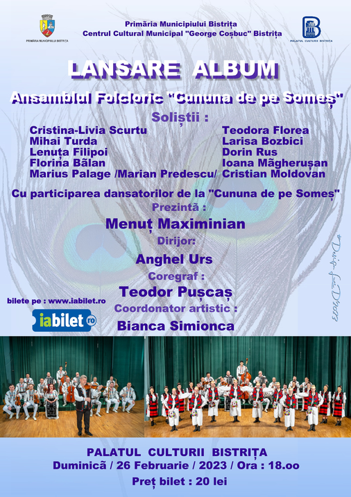 Primăria Municipiului Bistrița și Centrul Cultural Municipal „George Coșbuc” organizează un eveniment deosebit cu ocazia lansării unui nou album realizat de Ansamblul Folcloric „Cununa de pe Someș”. Mai multe detalii
