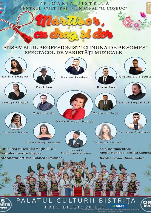 Primăria Municipiului Bistrița și Centrul Cultural Municipal „George Coșbuc” sărbătorește Ziua Internațională a femeii prin producția extraordinară „Mărțișor, cu drag și dor” la care își dau concursul Ansamblul Profesionist „Cununa de pe Someș” și valoroși colaboratori. Acesta va avea loc Duminică, 05 martie 2023, ora 18.00, la Palatul Culturii din Bistrița.