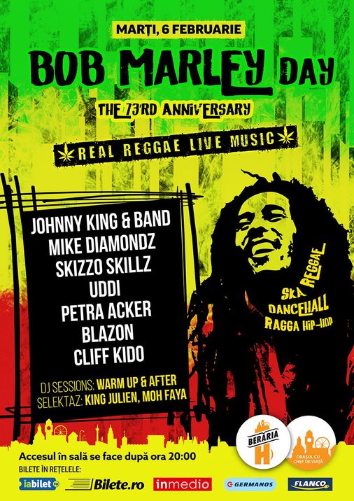 Marți, 6 Februarie, celebrăm aniversarea cu numărul 73 a legendarului Bob Marley alături de Johnny King & Band, Mike Diamondz, Skizzo Skillz, UDDI, Petra Acker, Blazon, Cliff Kido, etc.