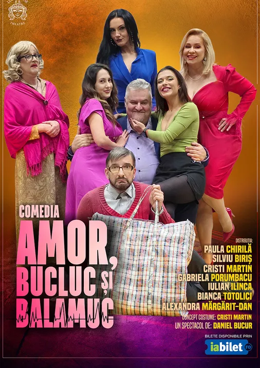 Spectacolul Amor, bucluc și balamuc este o comedie spumoasă, o farsă plină de situații de un umor savuros, cu o distribuție din care fac parte vedete, precum și talente în plină ascensiune: Paula Chirilă, Silviu Biriș, Cristi Martin, Gabriela Porumbacu, Iulian Ilinca, Bianca Totolici / Alexandra Mărgărit-Dan. Direcția scenică îi aparține regizorului româno-canadian Daniel Bucur, iar conceptul costumelor, lui Cristi Martin. Mai multe detalii