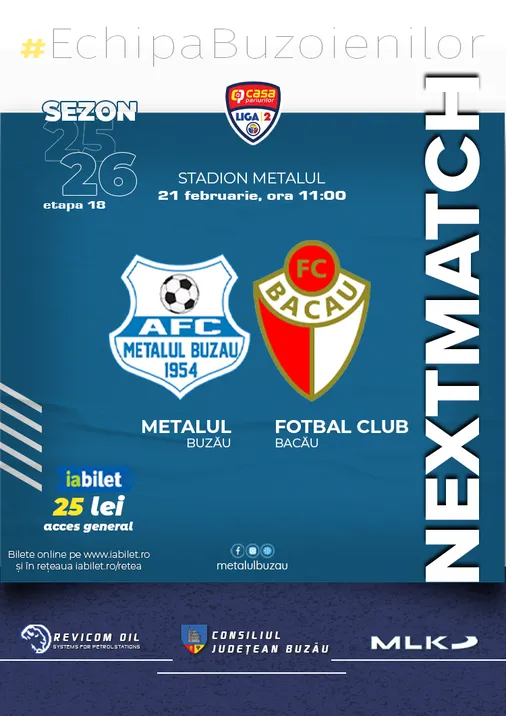 Liga 2 revine! Primul meci oficial din campionat în 2026. Haideți alături de noi la partida Metalul Buzău – FC Bacău, etapa 18 din Liga 2, programată sâmbătă, 21 februarie 2026, ora 11:00.