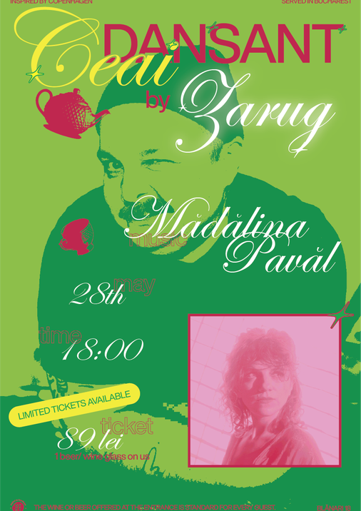 Cu un comic aparte și o personalitate fabuloasă, Zarug prezintă “Ceai Dansant by Zarug” în cadrul locației simply cool “G.Y.S.T.”, de pe Blănari 18, la fiecare două duminici. Pe 28 Mai, Mădălina Pavăl, aduce muzica lumească, ce te poate doini românește și învârti nebunește. Ca o detoxifiere de duminică, luăm “ceaiul” împreună pe ritmuri de dans și chef de vorbă.