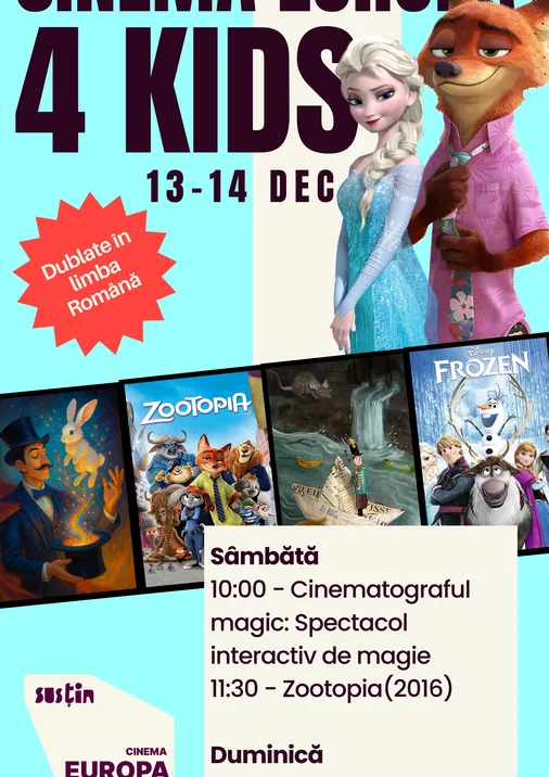 La Cinema Europa, magia prinde viață pentru cei mai mici spectatori! Un weekend în care scena și marele ecran se unesc pentru a crea momente memorabile, pline de culoare, veselie și descoperiri. Fiecare dimineață aduce o nouă poveste, o nouă aventură și o nouă ocazie ca cei mici să pășească într-un univers în care totul este posibil, iar fiecare clipă devine o amintire prețioasă.