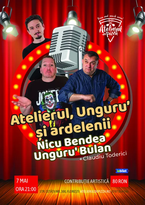Pe 7 mai 2026, de la ora 21:00, scena este preluată de greii comediei. Nicu Bendea și Unguru' Bulan aduc un nou show: ”Atelierul, Unguru' și ardelenii”. Se arată umor de calitate superioară, povești savuroase și hohote de râs care o să te țină mult și bine! Lasă scuzele, adună-ți gașca și haideți cu toții la o seară epică!