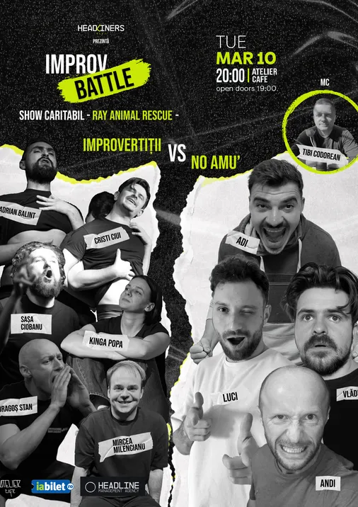 No, amu și Improvertiții intră în ring la Atelier cu un Battle de Improv care promite haos… din ăla bun. Râdem, ne distrăm și donăm — pentru Ray Animal Rescue