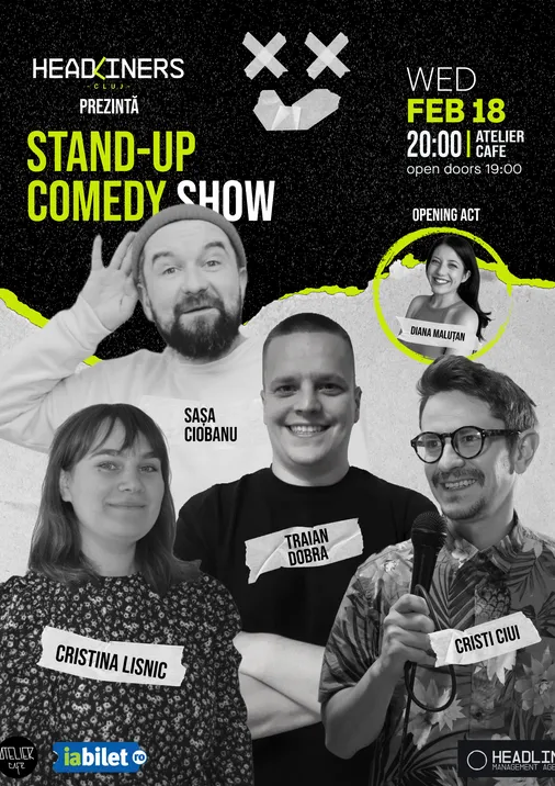 Pe 18, la Atelier Cafe, râdem la un show de Stand Up Comedy cu Cristian Ciui, Sașa Ciobanu, Traian Dobra și Cristina Lisnic.