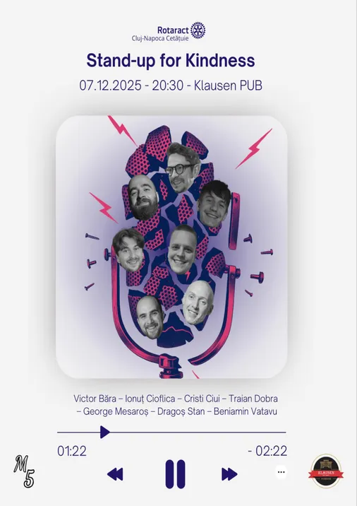 Stand-up for Kindness este o seară de stand-up cu scop caritabil, organizată de Rotaract Cluj-Napoca Cetățuie, în data de 07.12.2025, de la ora 20:30, la KlausenPUB House.