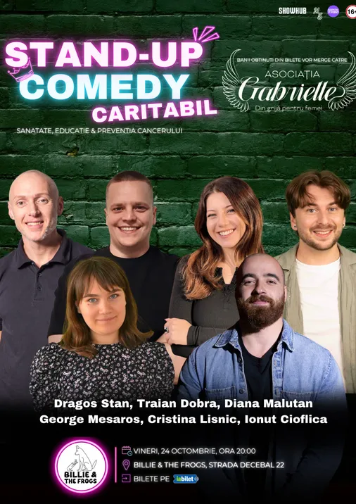 Te așteptăm la un spectacol de standup comedy caritabil la Billie and the Frogs cu ocazia Lunii Internaționale de Conștientizare a Cancerului de Sân. Toate veniturile vor fi donate către Asociația Gabrielle.