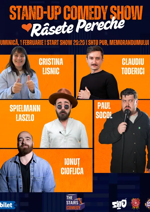 Cu Cristina Lisnic, Claudiu Toderici, Spielmann Laszlo, Paul Socol și Ionuț Cioflica. Te așteptăm duminică, 1 februarie, de la 20:20, la Shto Pub, să râzi pe săturate la „Râsete Pereche”. Mai multe detalii