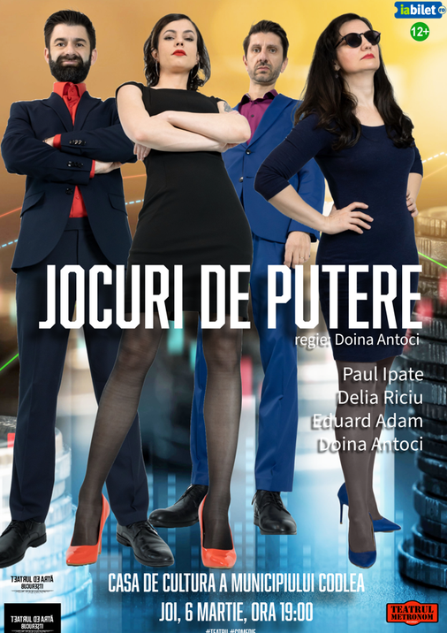 JOCURI DE PUTERE este un spectacol-coupe, conceput ca un serial teatral, ca un puzzle de povești al căror numitor comun este puterea și felul în care statutul, locul în ierarhie și jocurile de putere influențează comportamentul personajelor.