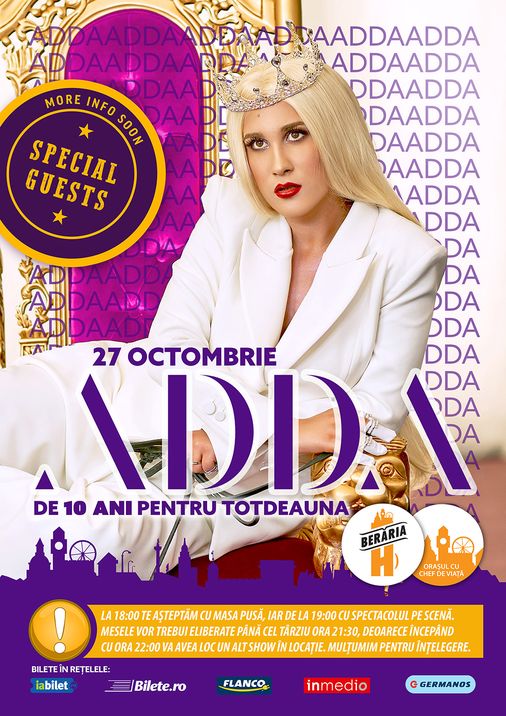 ADDA aniversează 10 ani de muzică printr-un super eveniment la Berăria H. Pe 27 octombrie, de la ora 19:00, ADDA va fi pe scenă pentru o experiență de neuitat, Un concert aniversar unde ești invitat să sărbătorești alături de ea. Dintre cele mai iubite piese ale sale, din 2008 și până în prezent, nu vor lipsi „Îți arăt că pot”, „Lupii”, „Minți murdare”, „Nu plânge, Ană”, „Se vede pe fața ei”, „De dorul tău”, „Te aud”, „Arde” și nici ultima creație semnată ADDA, „Mamă soacră”. Mai multe detalii