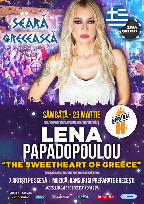 Cunoscută pentru farmecul și talentul ei incredibil, LENA PAPADOPOULOU este una dintre cele mai apreciate artiste din Grecia și Balcani. În cei peste 10 de ani de activitate la cel mai înalt nivel, artista din Salonic a dat lumii super hit-uri ca "Thelo Trella", "Kathe Nihta", "Apagoreumeni agapi" și multe altele, iar acum ai ocazia să le asculți LIVE, în Orașul cu Chef de Viață - Berăria H.