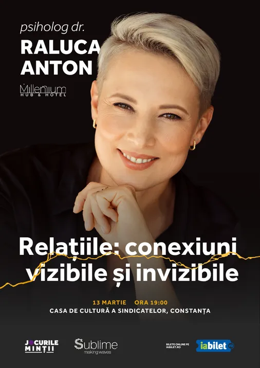 Psih. Dr. Raluca Anton te invită la o seară sub tema „Relațiile: conexiuni vizibile și invizibile”, o întâlnire despre felul în care legăturile dintre oameni ne modelează pe fiecare dintre noi.