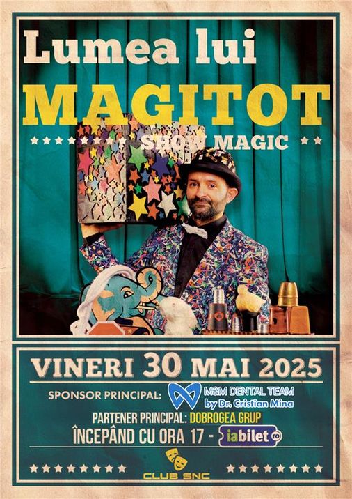 Pe 30 mai, de la ora 17:00, Sala Club SNC din Constanța devine poarta către „Lumea lui Magitot” – un spectacol plin de magie, umor și culoare, dedicat copiilor și părinților deopotrivă.