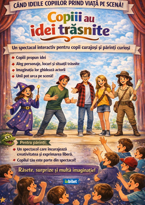 Copiii au idei trăsnite este un spectacol de improvizație interactiv dedicat copiilor și familiilor, în care imaginația celor mici prinde viață chiar pe scenă. Nimic nu este pregătit dinainte: personajele, locurile și aventurile se nasc pe loc, pornind din ideile, emoțiile și sugestiile venite direct din public.