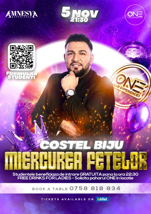 Pe 05 Noiembrie, de la ora 21:30, te așteptăm la One Club Experiences la o nouă ediție a conceptului „Miercurea Fetelor”, alături de Costel Biju.