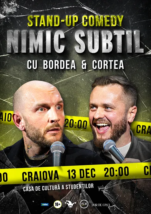 Cătălin Bordea și Nelu Cortea aleg calea directă în noul lor show de stand-up comedy - “Nimic subtil”. Și este exact ceea ce ai nevoie! Într-o lume care ne cere constant să fim cu perdea și să ne ascundem trăirile în spatele unui zâmbet politicos, Bordea și Cortea spun lucrurilor pe nume. Filtru? Nu există. Subtilitate? Zero. Glume? Din plin.