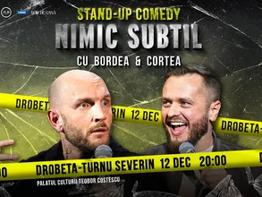 Cătălin Bordea și Nelu Cortea aleg calea directă în noul lor show de stand-up comedy - “Nimic subtil”. Și este exact ceea ce ai nevoie! Într-o lume care ne cere constant să fim cu perdea și să ne ascundem trăirile în spatele unui zâmbet politicos, Bordea și Cortea spun lucrurilor pe nume. Filtru? Nu există. Subtilitate? Zero. Glume? Din plin. Mai multe detalii