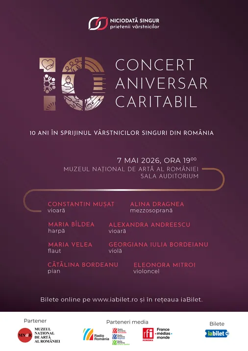 Concertul aniversar caritabil marchează 10 ani de la înființarea Asociației Niciodată Singur – Prietenii Vârstnicilor și 10 ani de impact real în viața seniorilor din România, perioadă în care organizația a ajuns la sute de bunici, oferindu-le sprijin concret și prezență umană.