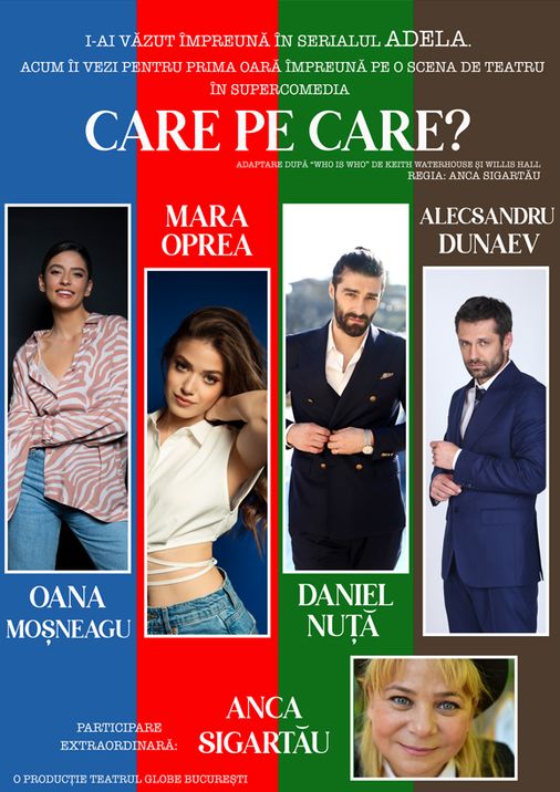 După extraordinarul succes pe care l-au avut cu serialul « Adela » în care au jucat rolurile principale, spectacolul “Care pe care?” – adaptare după “Who is who” de Keith Waterhouse și Willis Hall, îi aduce împreună, pentru prima oară pe scena unui teatru pe Anca Sigartău, Oana Moșneagu, Mara Oprea, Alecsandru Dunaev și Daniel Nuță.
