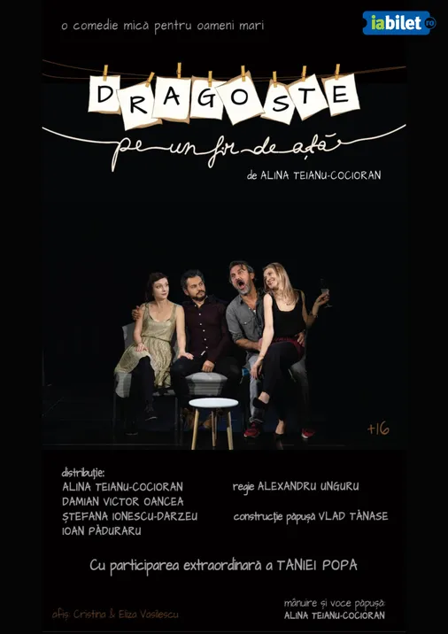 „Dragoste pe-un fir de ață”, o comedie mică pentru oameni mari, scrisă de Alina Teianu-Cocioran și regizată de Alexandru Unguru.
