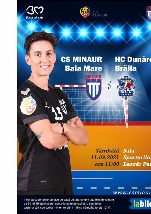 IIn data de 11 septembrie 2021, incepand cu ora 11:00 se va desfacura meciul de handbal feminin dintre CS Minaur Baia Mare si HC Dunarea Braila, din etapa a IIa a Ligii Florilor MOL, in Baia Mare Sala Sporturilor "Lascar Pana"