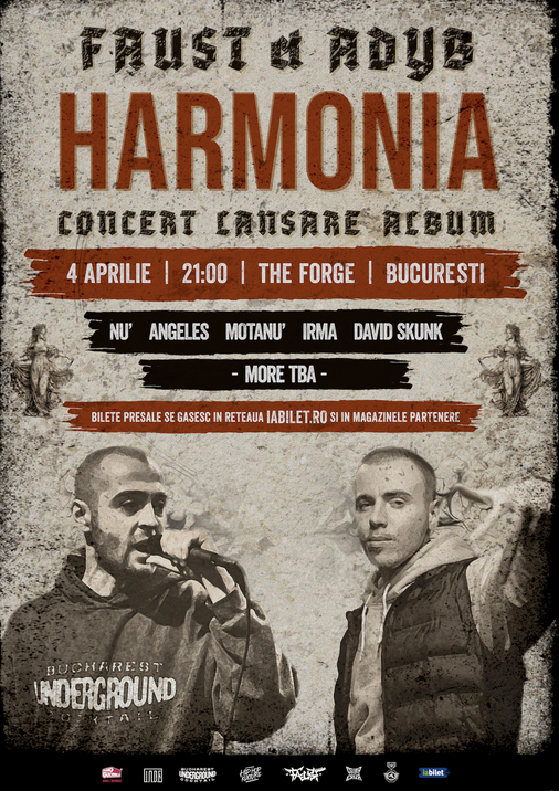 Pe data de 4 Aprilie, Faust & AdyB va invita la lansarea oficiala a materialului "Harmonia", realizat de catre cei doi in decursul ultimelor luni. Concertul se desfasoara in The Forge, in Bucuresti. Alaturi de artistii in cauza, vor lua parte la eveniment si invitatii de pe material, plus alti colaboratori, printre care enumeram in prima faza: Motanu, NU', David Skunk, Irma si Angeles, Defect (DJ), restul urmand sa fie anuntati pe parcurs. Sa ne vedem cu bine!