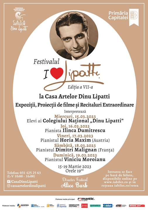 Casa Artelor Dinu Lipatti vă invită în perioada 15 -19 martie 2023 la cea de-a VII-a ediție a Festivalului „I love Lipatti”, dedicată împlinirii a 106 ani de la nașterea compozitorului și celui mai mare pianist român al tuturor timpurilor, Dinu Lipatti (19 martie 1917 – 2 decembrie 1950). Mai multe detalii