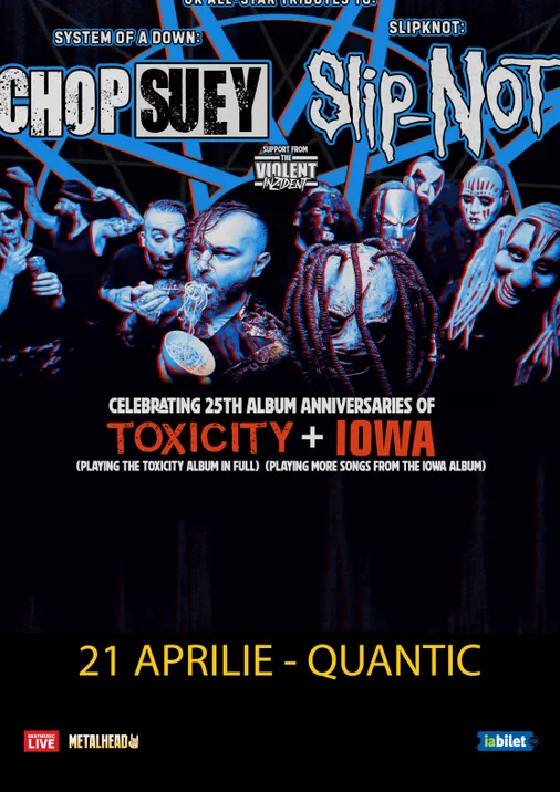 Pe 21 aprilie Forever NU!: Tribute Festival Tour cu Slip-Not, Chop Suey si Violent Inzident la Club Quantic. Avem parte de tributuri live Slipknot si System of a Down iar primele 200 de bilete au pret earlybird. Turneul aniverseaza 25 de ani de la lansarea albumelor TOXICITY de la System of a Down si IOWA de la Slipknot asa ca setlistul va fi plin de piese de pe acestea. Albumul TOXICTY, de exemplu, va fi cantat integral!