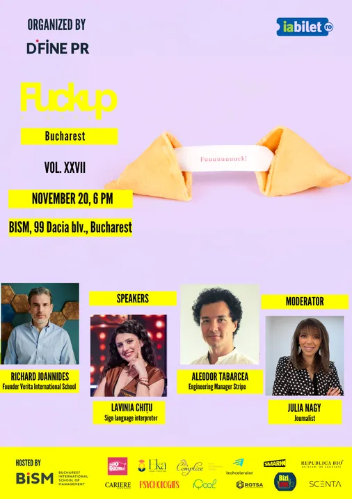 Fuckup Nights Bucharest este o mișcare globală ce are loc în peste 250 de orașe ale lumii, care aduce laolaltă, într-un stil informal, inovativ și cu scop educațional, persoane din mediul de business și nu numai, care povestesc cu deschidere și curaj despre momentele provocatoare din carieră și rolul acestora în parcursul lor profesional, cum și-au schimbat paradigma și cum au reușit să le privească drept oportunități, și nu eșecuri. Mai multe detalii
