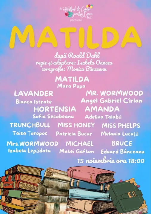 Cu: Mara Popa (Matilda), Bianca Istrate (Lavander), Angel Gabriel Cîrlan (Mr. Wormwood), Sofia Secobeanu (Hortensia), Adelina Talabă (Amanda), Taisa Țoporac (Trunchbull), Patricia Bucur (Miss Honey), Melanica Lucuță (Miss Phelps), Izabela Lepădatu (Mrs. Wormwood), Matei Gafton (Michael) și Eduard Bănceanu (Bruce).