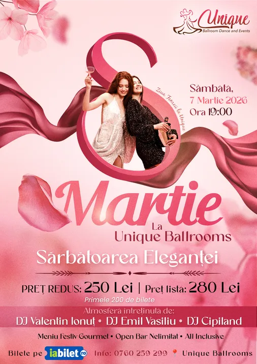 Vă invităm să celebrați Ziua Femeii într-un cadru elegant. Unique Ballrooms organizează o petrecere dedicată publicului larg, cu meniu festiv complet, open bar și divertisment live asigurat de DJ Valentin Ionuț, DJ Emil Vasiliu și DJ Cipiland. Accesul se face pe bază de bilet.