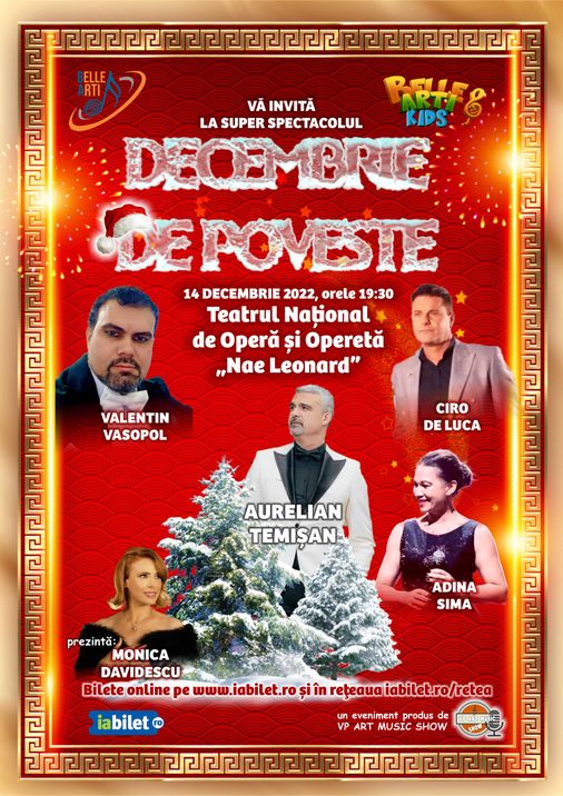 “Decembrie de poveste” – Aurelian Temisan si invitatii sai vor interpreta cele mai frumoase piese de iarna din repertoriul romanesc si international. Alaturi de cei 4 artisti consacrati : Andrei Stefanescu, Adina Sima si vedeta italiana Ciro de Luca, vor evolua pe scena cele mai tari 10 mini vedete, tineri talentati in interpretarea muzicii pop. Prezentarea spectacolului este asigurata de actrita Teatrului National Monica Davidescu.
