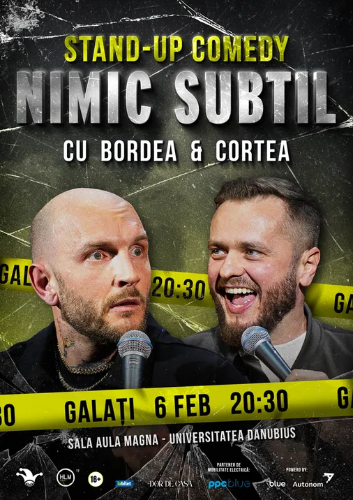 Cătălin Bordea și Nelu Cortea aleg calea directă în noul lor show de stand-up comedy - “Nimic subtil”. Și este exact ceea ce ai nevoie! Într-o lume care ne cere constant să fim cu perdea și să ne ascundem trăirile în spatele unui zâmbet politicos, Bordea și Cortea spun lucrurilor pe nume. Filtru? Nu există. Subtilitate? Zero. Glume? Din plin.
