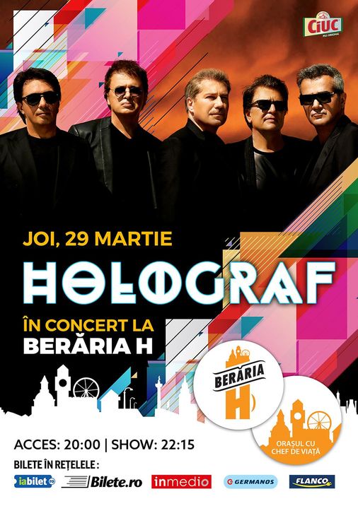 Joi, 29 Martie, Holograf revine în Orașul cu Chef de viață pentru un concert de care îți vei aduce aminte multă vreme. "Să nu-mi iei niciodată dragostea", "Ți-am dat un inel", "Vine o zi" și multe alte hit-uri ale prestigioasei trupe vor răsuna din nou live pe Arena de la Berăria H. Mai multe detalii