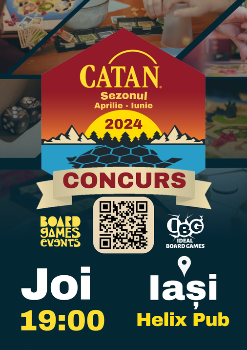 Acest eveniment face parte din sezonul Aprilie-Iunie 2024, la finalul căruia vom face un total general al punctelor acumulate în toate participările la competițiile amicale de Catan, iar jucătorul cu cele mai multe astfel de puncte va primi un joc din partea Ideal Board Games. Vom premia persoana care vine la cele mai multe evenimente marca Board Games Events de orice fel în aceste 3 luni. *Obligatorie deținerea unui cont pe aplicația https://boardgamesevents.com, cu care să participați la aceste evenimente.