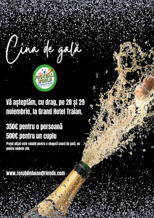 Pe 28 si 29 noiembrie, Hotel Traian devine gazda unui eveniment cu adevărat special incepand cu ora 20:30 – Dineul Oficial cu jucătorii celor două echipe, un moment unic în care pasionații de sport și iubitorii de experiențe premium se întâlnesc cu legende ale fotbalului mondial. Invitat de marcă: Ronaldinho, unul dintre cei mai spectaculoși și iubiți fotbaliști ai tuturor timpurilor.