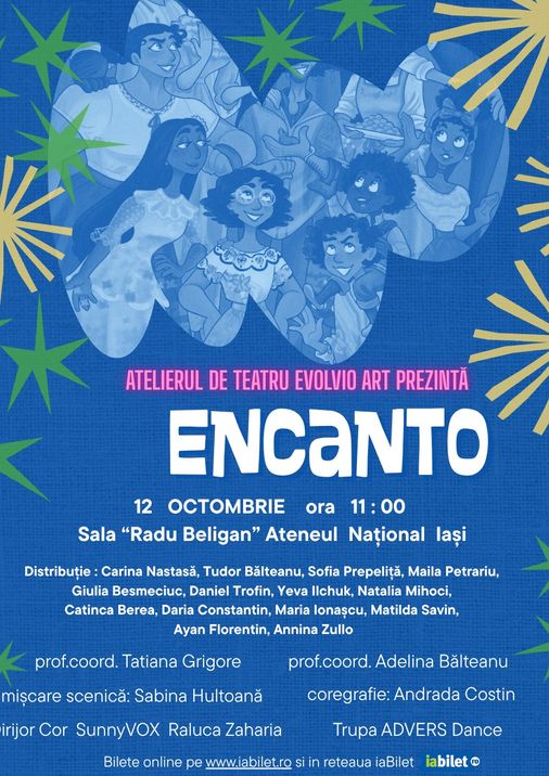 Atelierul de Teatru Evolvio Art vă invită la Spectacolul De Teatru muzical ENCANTO, o producție plină de culoare, emoție și energie, inspirată de celebra poveste a familiei Madrigal.