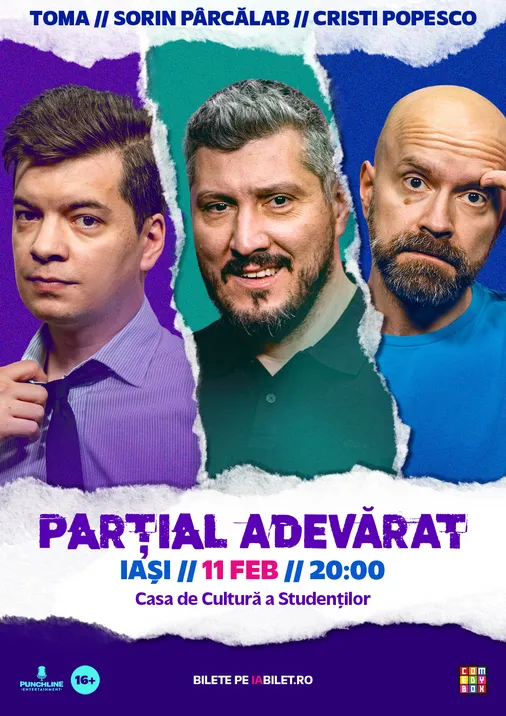 Îi știi de la televizor, de pe YouTube sau de la ComedyBox. I-ai văzut în Una Scurtă, Râzi că Prostu’ sau te-ai uitat la podcastul Ceva Mărunt, iar acum poți să-i vezi LIVE! Sorin Pârcălab, Cristi Popesco și Toma pleacă toamna asta în turneu cu material nou, glume noi și povești care te vor face să râzi în hohote! Hai să-i vezi și tu în cel mai nou show al lor: Parțial Adevărat! Locurile sunt limitate, așa că ia-ți biletele din timp și asigură-ți locul la cel mai așteptat show de Stand-up Comedy al toamnei!
