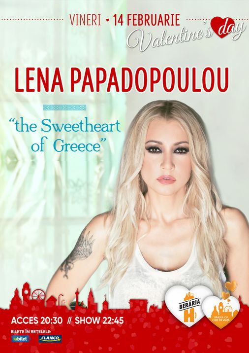 Așa că vineri - 14 februarie - vino să asiști la un show de zile mari alături de una dintre cele mai apreciate artiste din Grecia și Balcani. În cei peste 10 de ani de activitate la cel mai înalt nivel, artista din Salonic a dat lumii super hit-uri ca "Thelo Trella", "Kathe Nihta", "Apagoreumeni agapi" și multe altele, iar acum ai ocazia să le asculți LIVE, în Berăria H.