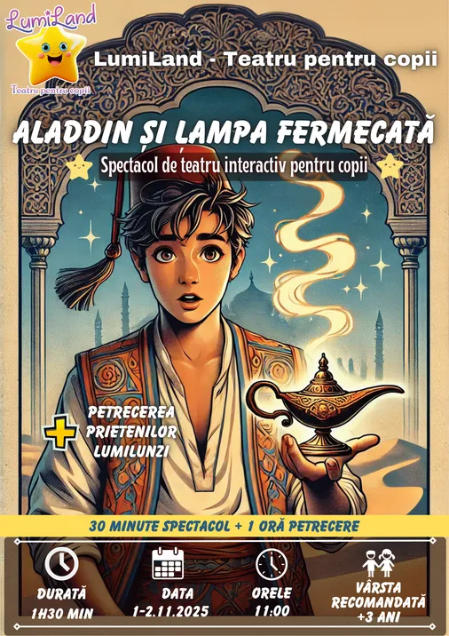 „Aladdin și lampa fermecată" prinde viață într-un spectacol de teatru interactiv la LumiLand, unde copiii nu doar urmăresc povestea, ci devin parte din ea! Mai multe detalii