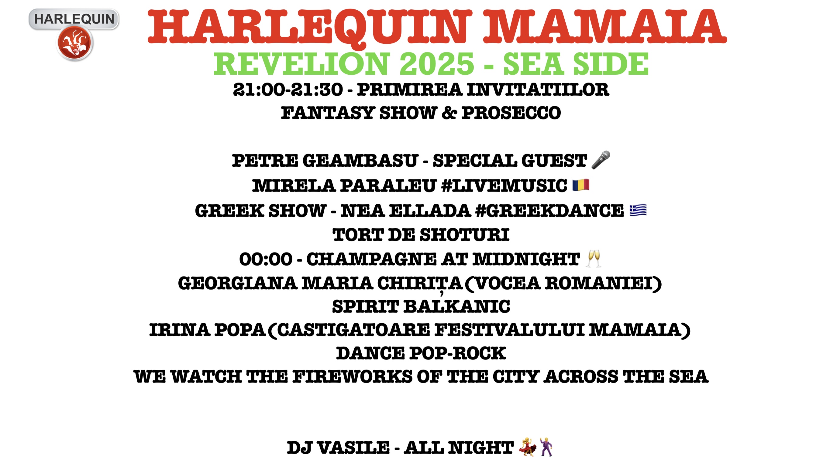 As the year comes to an end, let's Welcome together 2025, into a Restaurant Edition of Harlequin By The Sea on our New Year's Eve party that you can't miss. We are preparing an amazing event, good music, stunning lights, laughter, and cheerfulness.