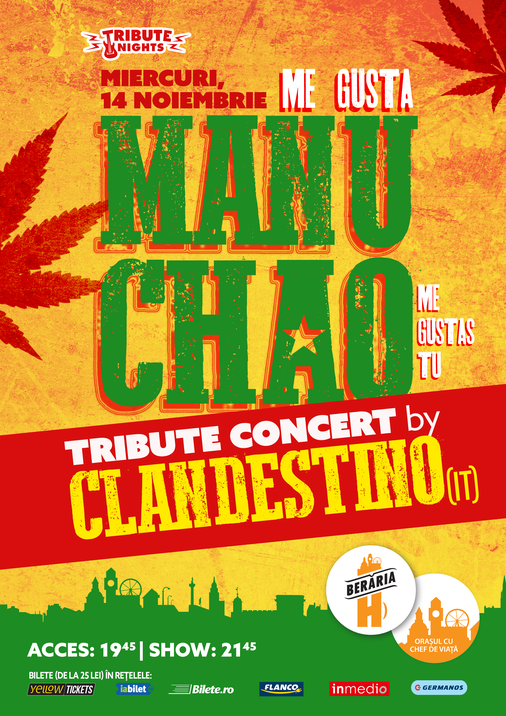 Manu Chao este un cântăreț francez cu origini spaniole care a devenit cunoscut în întreaga lume odată cu lansarea albumului "Clandestino". Artistul este renumit pentru faptul că poate cânta în limbi diferite precum franceza, engleza, spaniola, catalana, portugheza, galiciana, araba și wolof. De asemenea, genurile pe care le abordează sunt la fel de diferite, combinând muzica reggae cu rock, rumba și ritmuri braziliene. Hit-ul care i-a adus cea mai multă notorietate se numește "Me gustas tu", iar pe 14 noiembrie ai ocazia să-l asculți LIVE, alături de celelalte piese preferate, în interpretarea celor de la Clandestino.