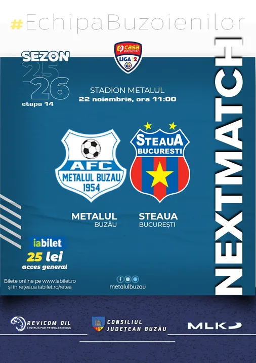 Haideți să ne bucurăm împreună de fotbal. Haideți alături de noi la partida Metalul Buzău – Steaua București, etapa 14 din Liga 2, programată sâmbătă, 22 noiembrie 2025, ora 11:00. Mai multe detalii