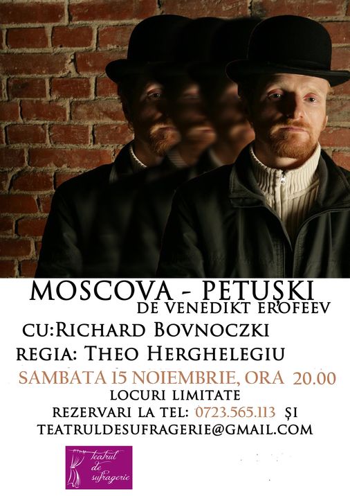 Participarea in limita a 20 de locuri disponibile. Pentru bilete si detalii [email protected], bilete online www.iabilet.ro. Teatrul de Sufragerie, Str. Grigore Cobalcescu nr. 51, Sector 1, Tel: 0723.565.113.www.teatruldesufragerie.ro