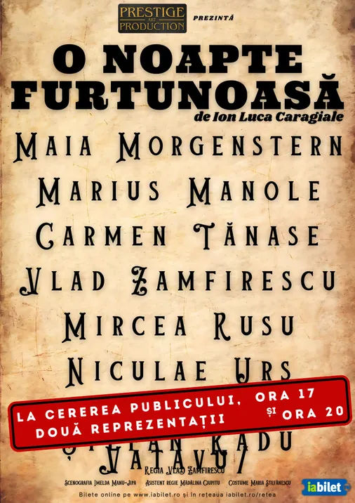 Un spectacol alert și surprinzător, de un comic exploziv, care te pune pe gânduri, cu o distribuție excepțională – este „O noapte furtunoasă” despre valori naționale și personale, despre haz de necaz, despre patrioți și familiști, ciocoi și ziariști care combat, dar mai ales despre iubire, în formele ei mai mult sau mai puțin... tradiționale.